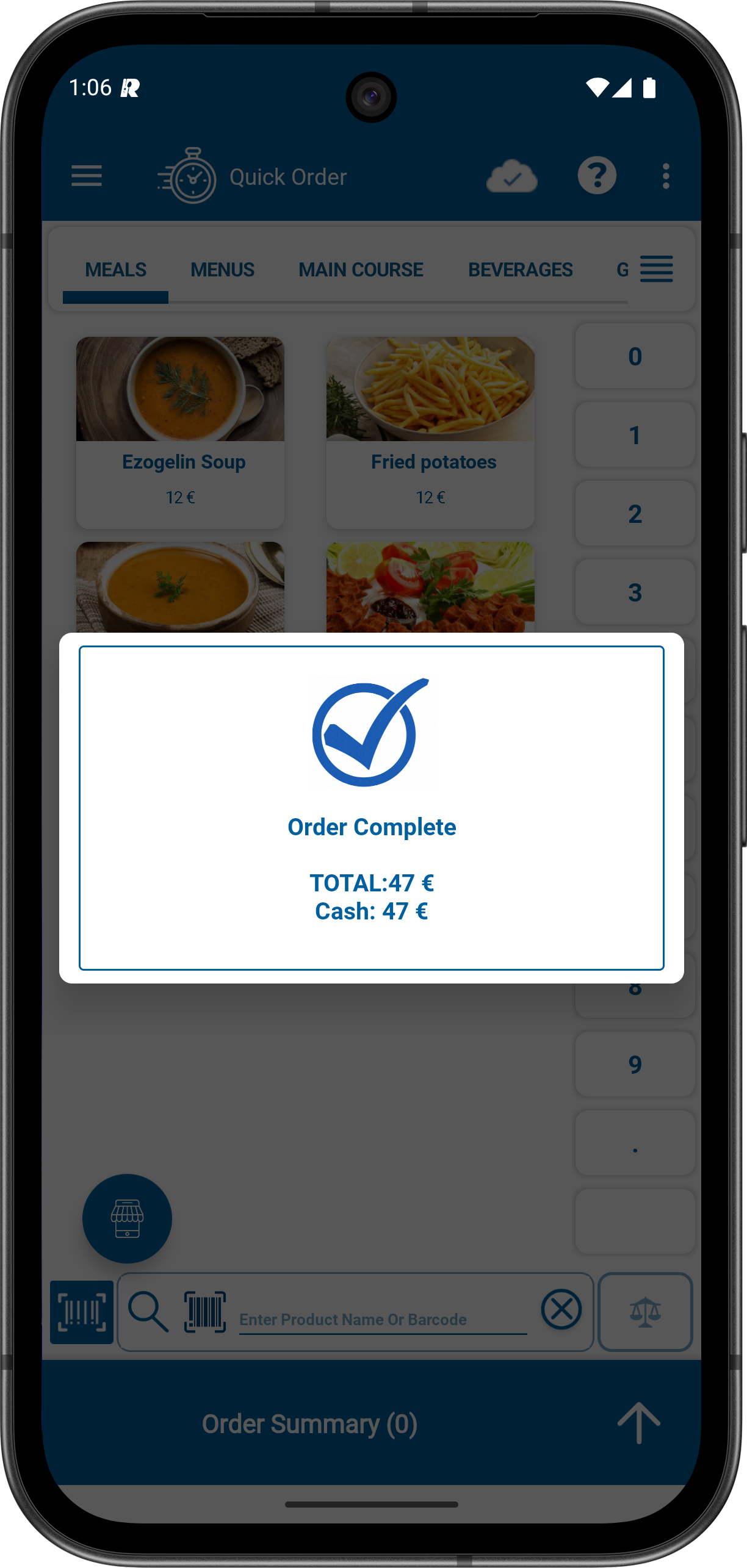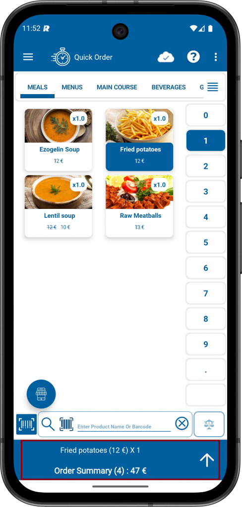 3- Select the relevant products from the categories. For example, products from the MEALS category will be selected. After selecting the products, proceed to the order summary screen.