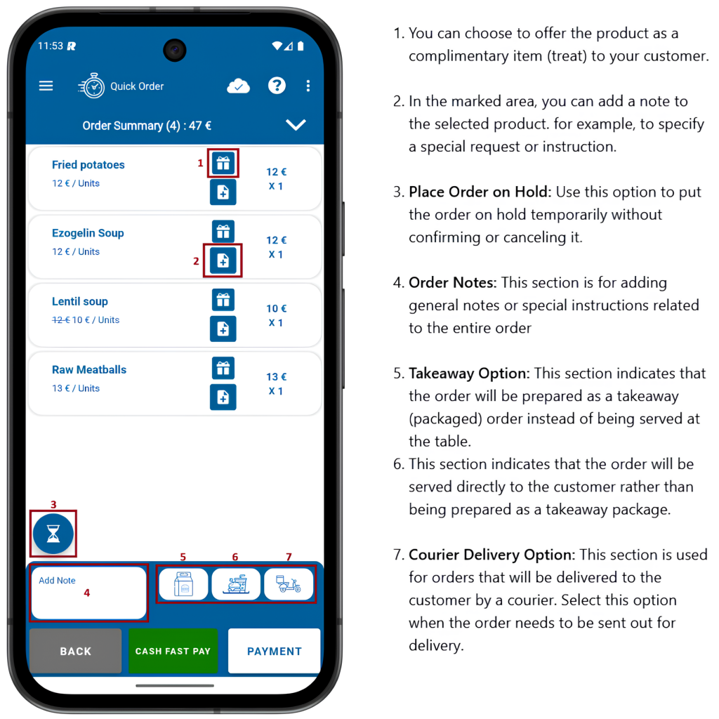 4- On the order summary screen, you can add new products, increase or decrease the quantity of existing ones, or remove items from your order. After completing these steps, click the payment button to finalize your order.
