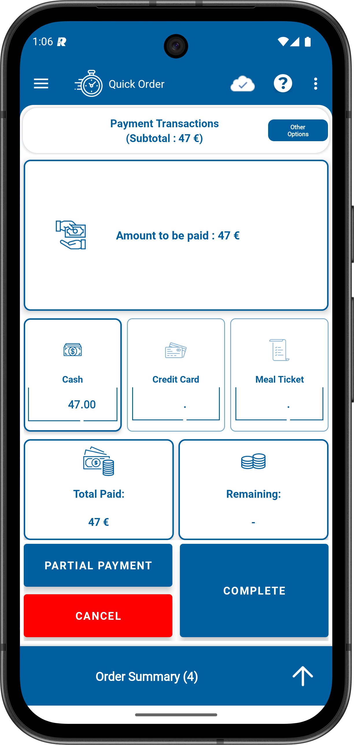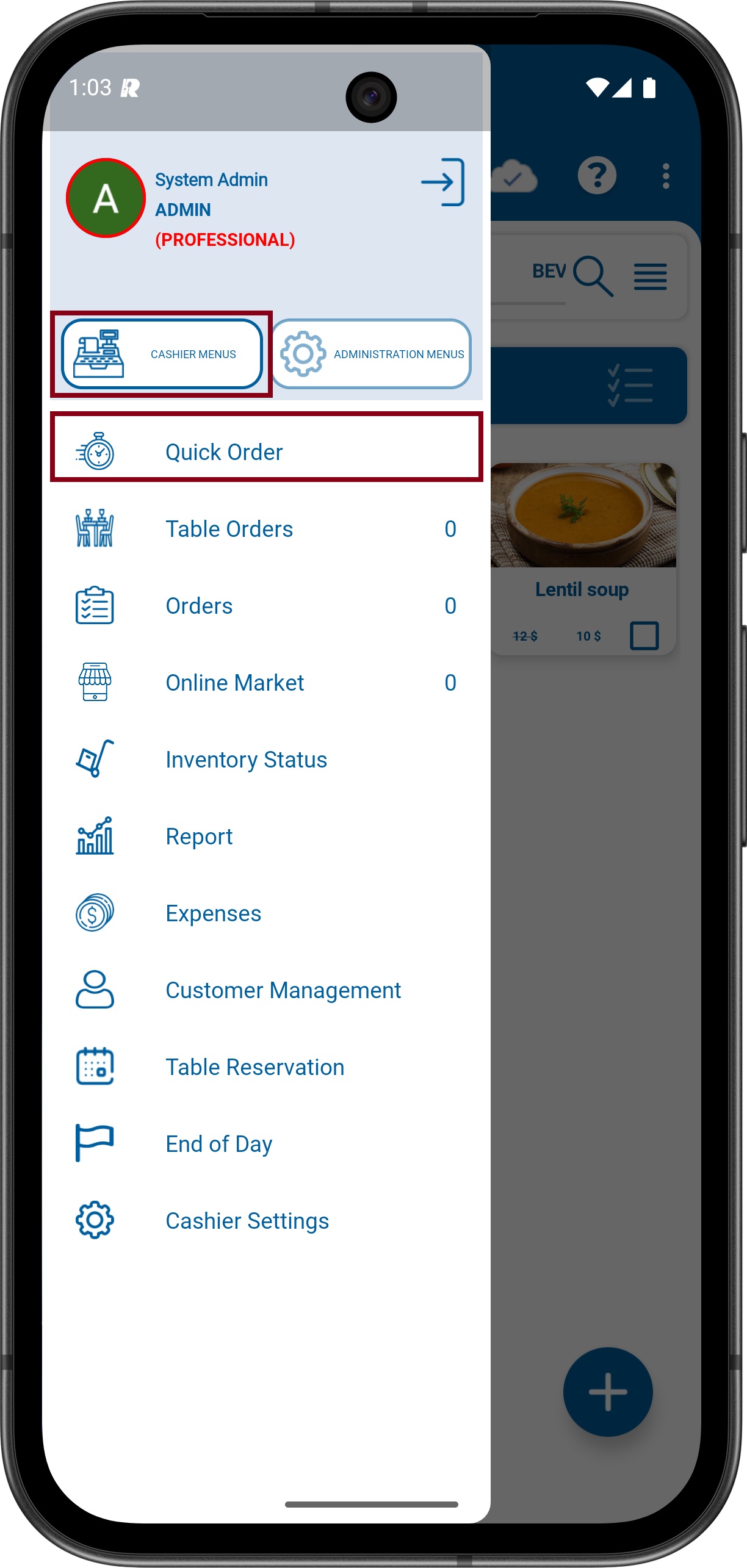 2- Click to Menu icon on the upper Left. Click to CASHIER MENUS and then click to Quick Order.