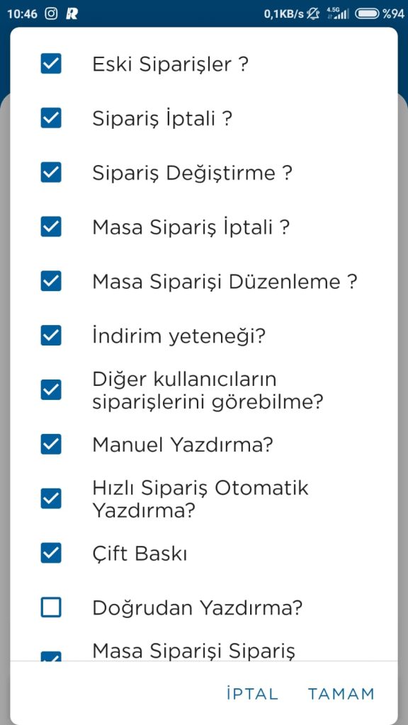 Diğer kullanıcıların siparişlerini görebilme: Diğer garsonların ve kasaların siparişlerini görebilme yetkisi.