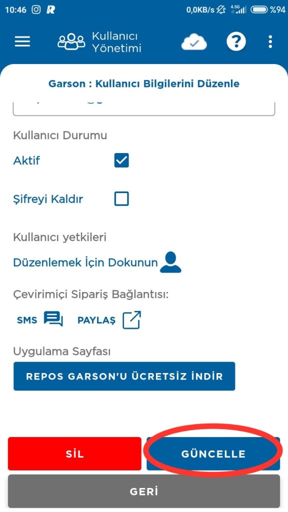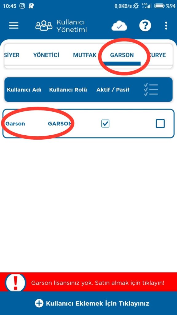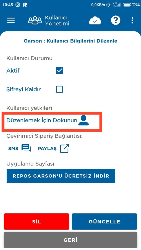 3- Kullanıcı kategorilerinden Garson Bölümüne giriş yapın. Ayrıcalıklarını düzenlemek istediğiniz Garson Kullanıcıya dokunun.