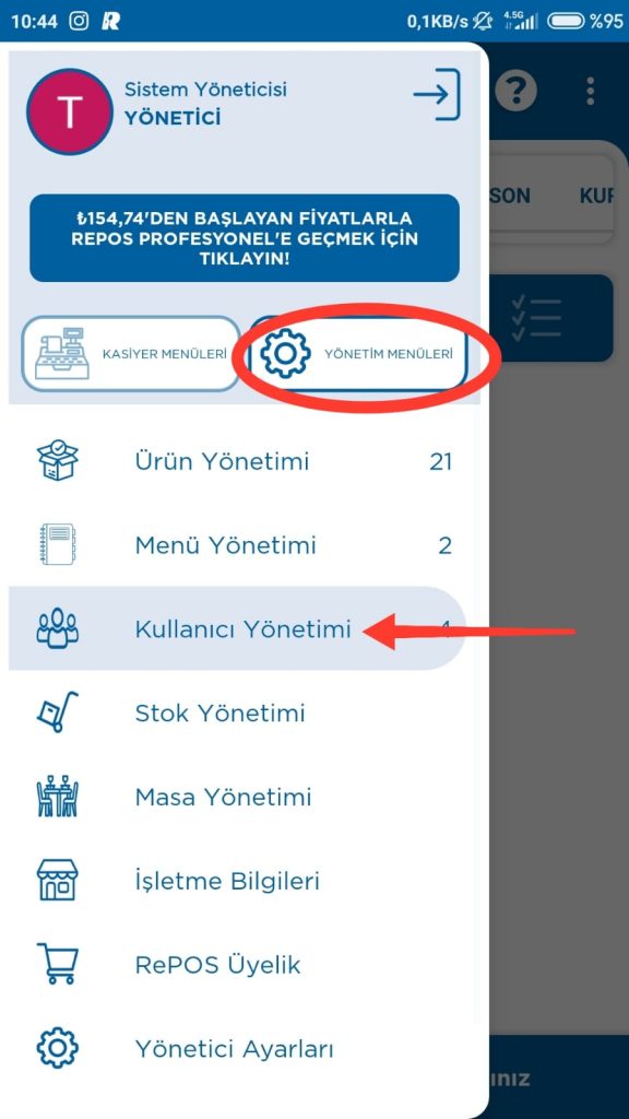 1- RePOS uygulamasına “SİSTEM YÖNETİCİSİ” kullanıcısıyla giriş yapın.