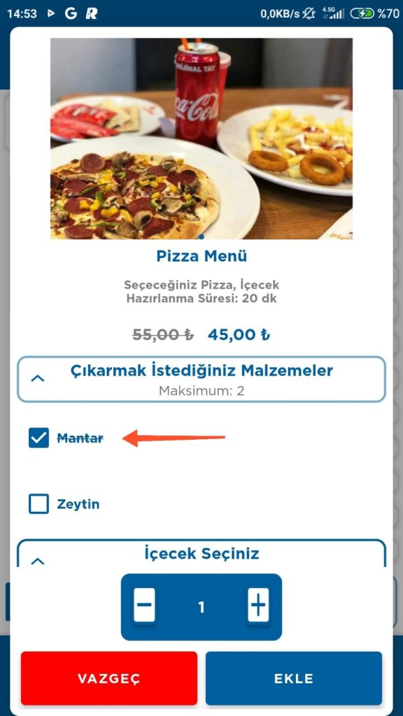 4- Seçilen ürüne eklemek ve çıkarmak istediğiniz malzemeleri seçin. Örneklerde bulunan Maksimum:2 ibaresi en fazla 2 adet ürün seçilebileceğini ifade eder. Bu koşul menü oluşturulurken belirlenmiştir, bu değeri isterseniz değiştirebilirsiniz. Veya isterseniz minimum eklenme koşulu da ekleyebilirsiniz. Menü oluşturma ile ilgili yardım sayfasına şuradan ulaşabilirsiniz: Ürünlerinizden Menü nasıl oluşturulur?