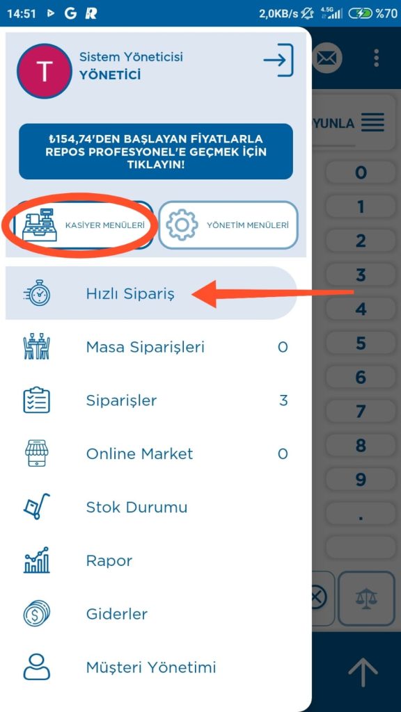 1- Sistem Yöneticisi olarak giriş yapın. Sol üstteki üç çizgiye dokunun. Açılan sürgülü menüdeki Kasiyer Menüleri bölümünden Hızlı Sipariş Sekmesine giriş yapın.