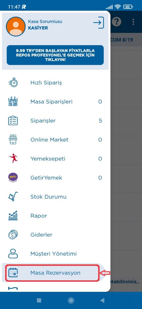 1- RePOS uygulamasına Kasa veya Yönetici Kullanıcısı ile giriş yapılır. Bu anlatım Kasa Kullanıcısı ile yapılacaktır. Sol üst sürgülü kısımdan Masa Rezervasyon sekmesine giriş yapılır.