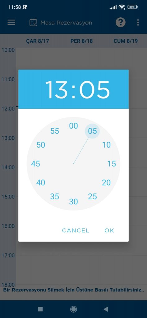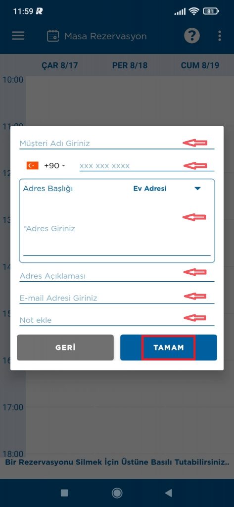 3- Rezervasyon bilgileri yazılır. Tamam butonuna dokunulurak rezervasyon işlemi tamamlanır.