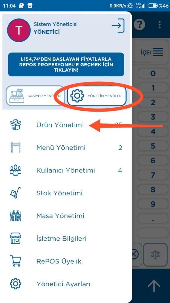 1- Sistem Yöneticisi olarak giriş yapın. Sol üstteki üç çizgiye dokunun. Açılan sürgülü menüdeki Ürün Yönetimi sekmesine giriş yapın.